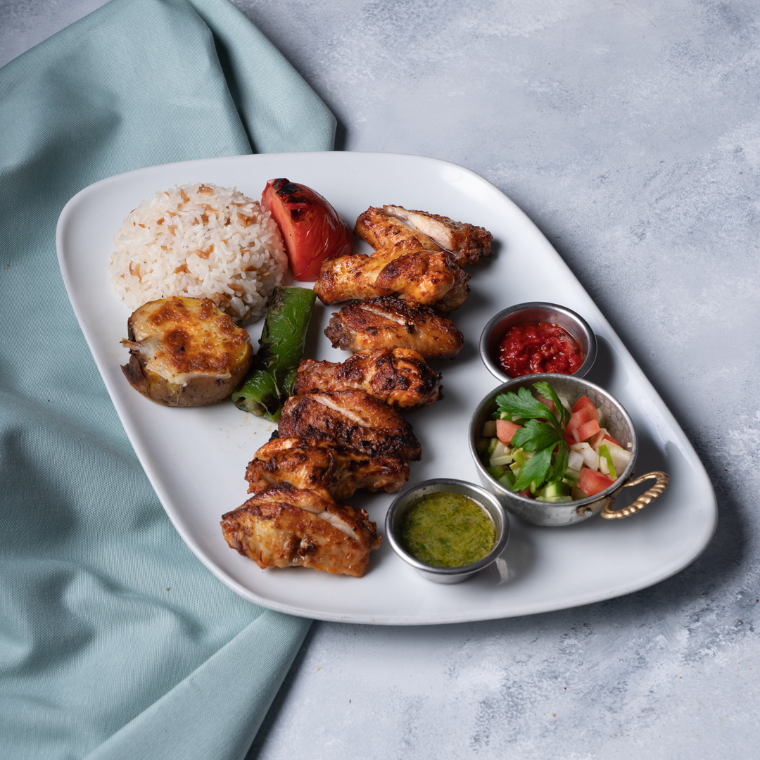 (Served with 1 portion adana kebab, 1 portion chicken wings, 1 portion grilled chicken, 1 portion grilled lamb, 2 piece chicken chop , 1 portion eggplant kebab, baked potato, rice, grilled tomato, grilled pepper and salad)
